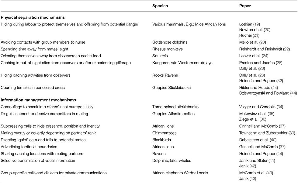 The table below summarises different mechanisms that animals employ to manage their privacy and their functions:
